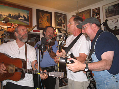 | Where's Mike-o? The intimate confines of the Cook Shack stage make it easy to lose sight of a band member. But the fun part is the bluegrass-style clustering that results. | ![]() |