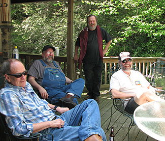 Before the show...The band relaxing on the deck of the mountain home loaned to them for the day. The duck flew in with some friends. (This section of pics by Bren Overholt) |